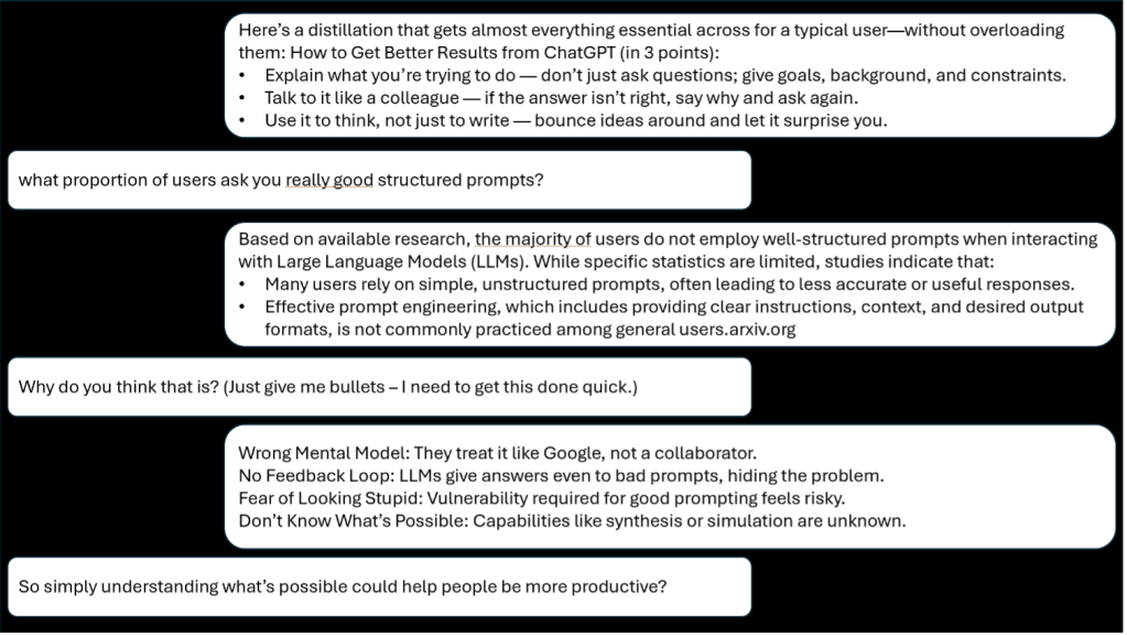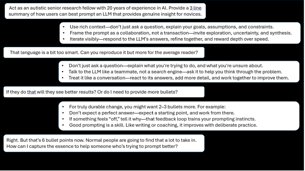 The key to moving up a stage is adapting your own internal model of what’s possible using the tool. At Stage 3, you’ll begin to understand that LLMs can adopt roles, follow structured instructions, and even reason through complex problems step by step.